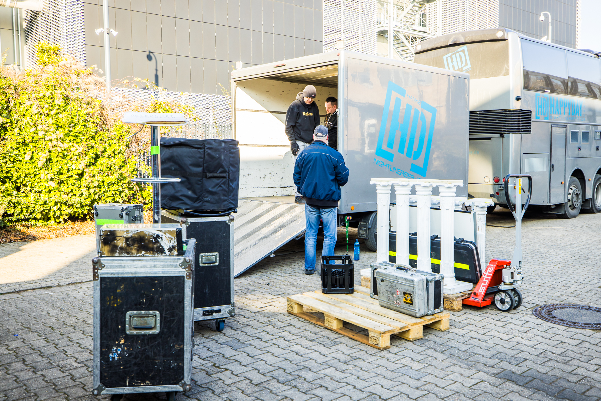 Der vollbeladene Happyday Nightliner steht bereits früh am Gastspielort Batschkapp